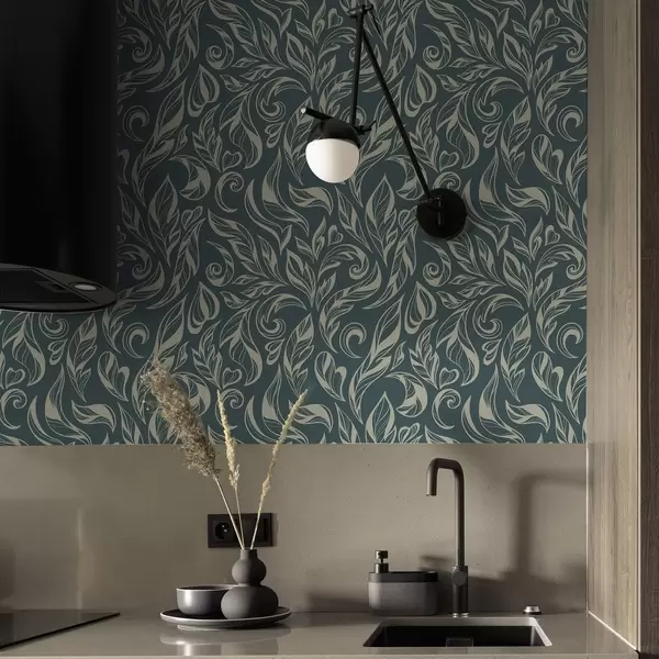 Papel pintado Patrón de hojas con líneas claras sobre fondo azul grisáceo. a00940