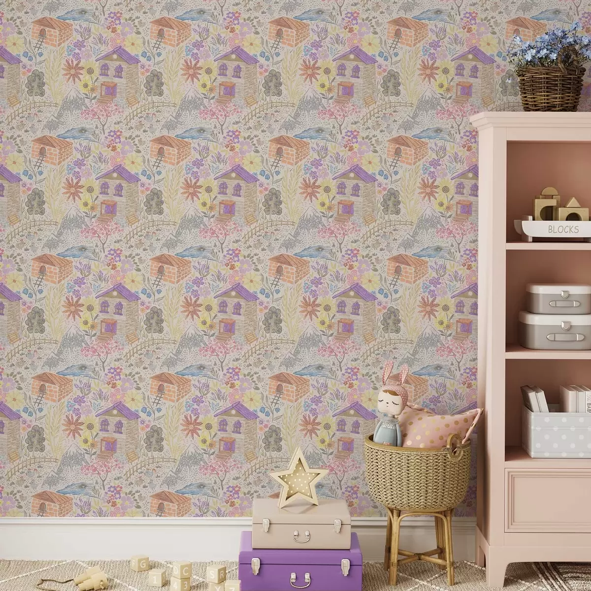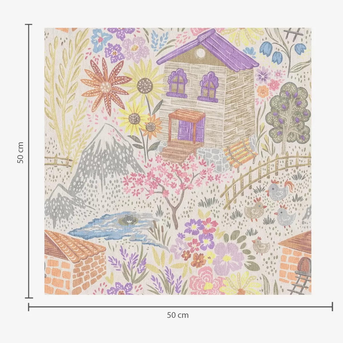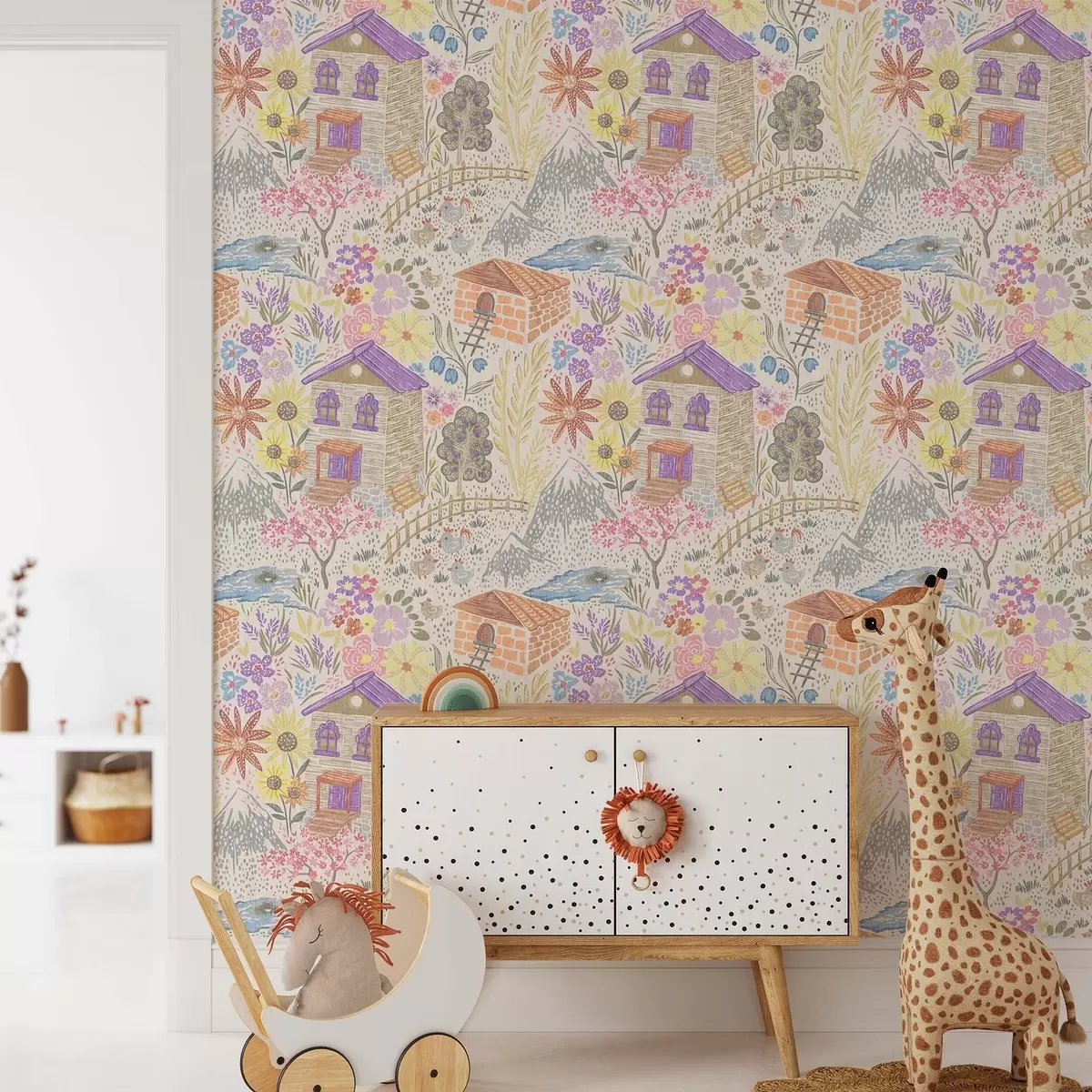 Papel pintado Dibujo infantil de un pueblo con una casa, montañas y flores. a00952