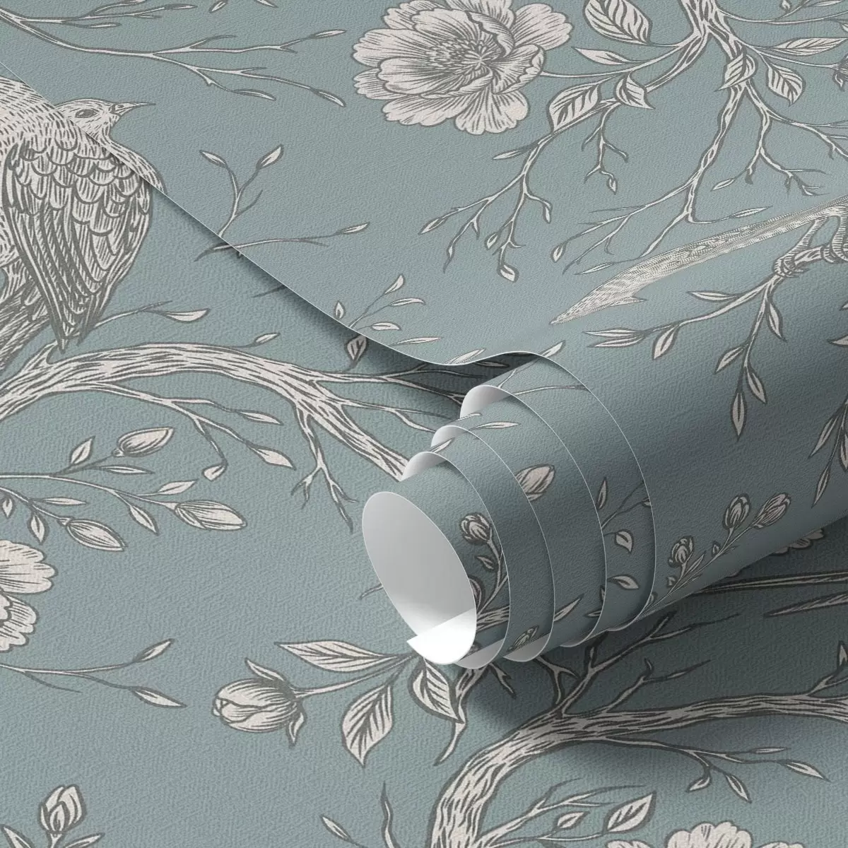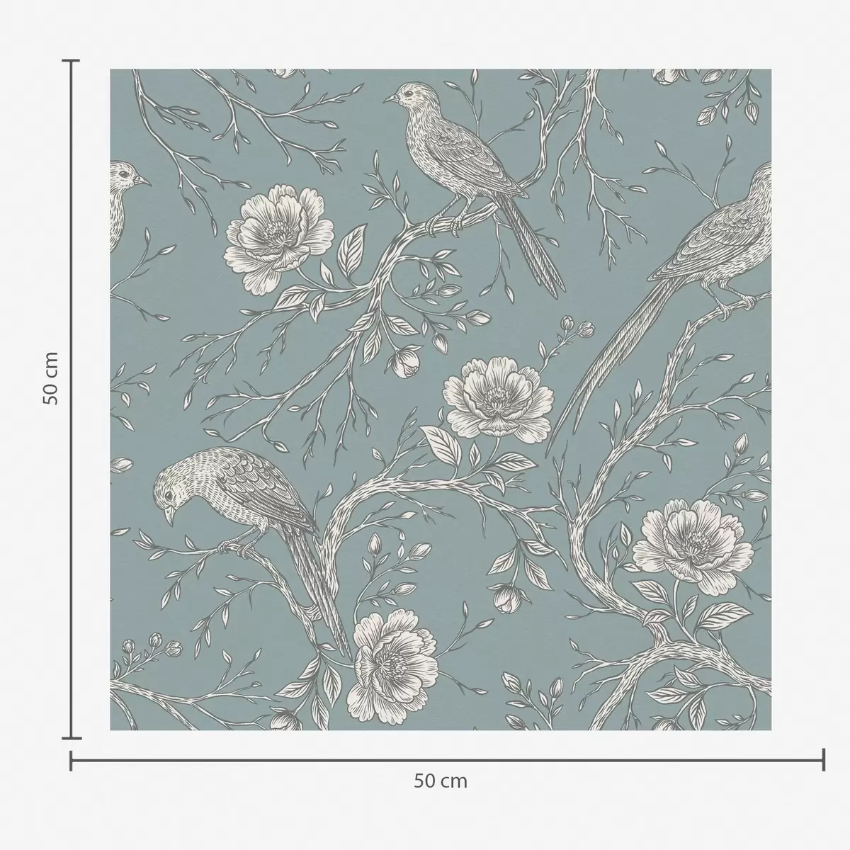 Papel pintado Pájaros dibujados en contorno sobre ramas, fondo azul apagado. a01022