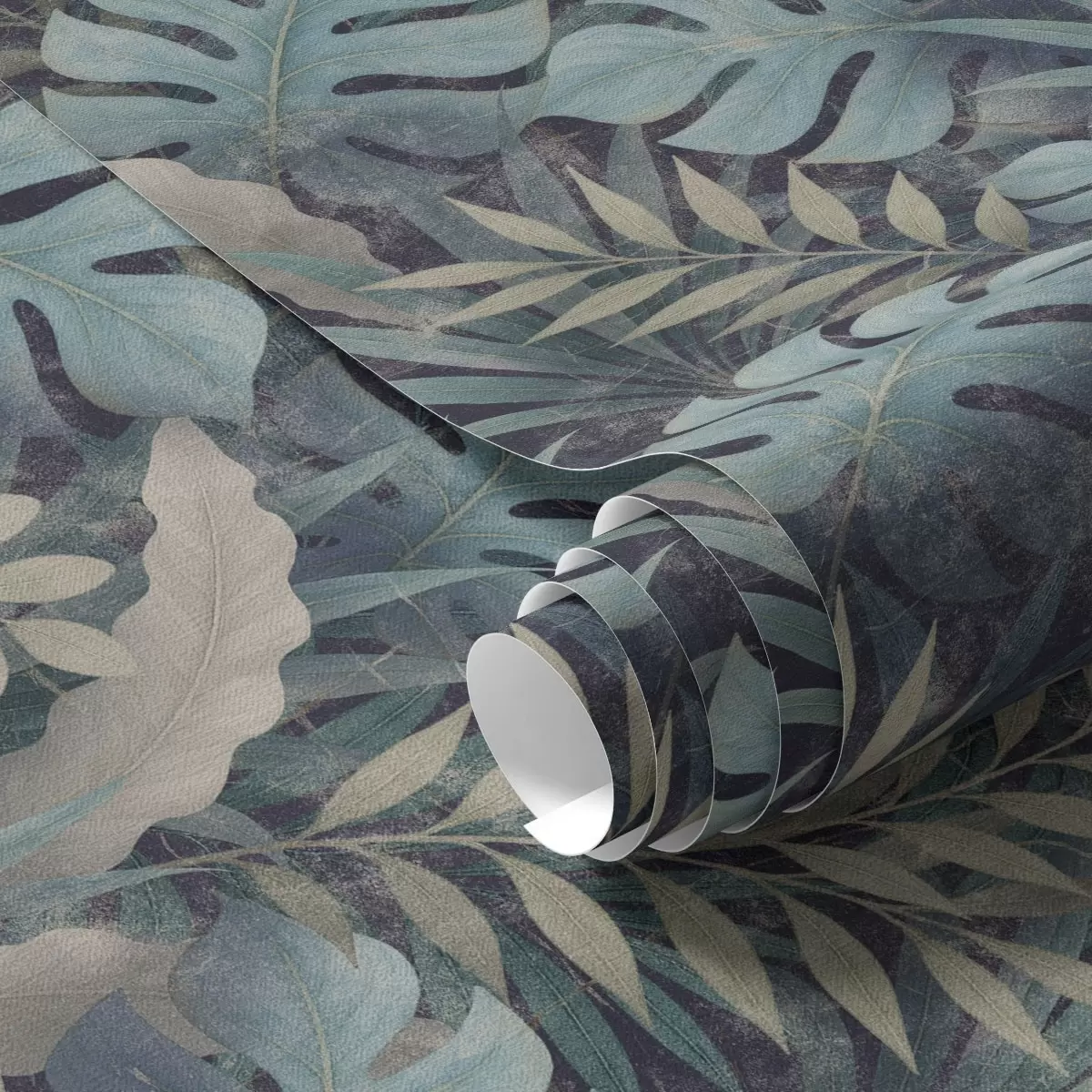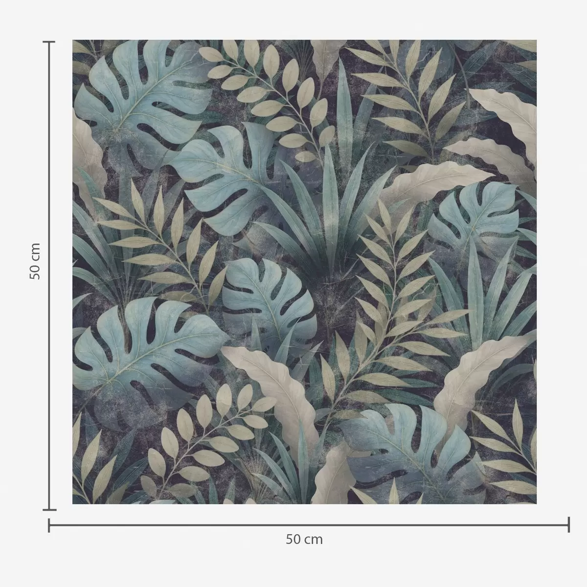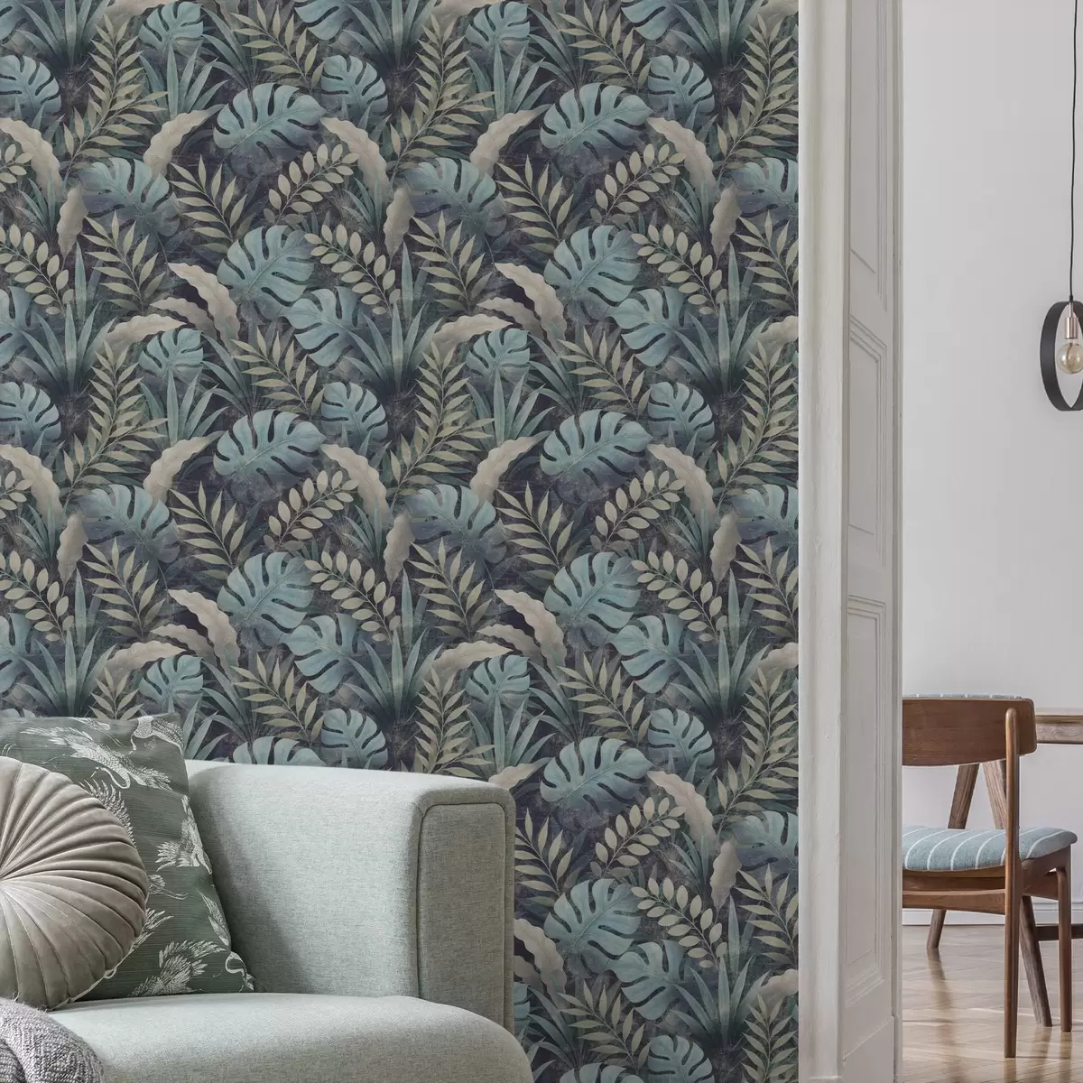 Papel pintado Follaje tropical en tonos azul verdosos fríos. a01035