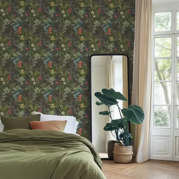 Papel pintado Jardín tropical oscuro con flores y follaje brillantes. a01079