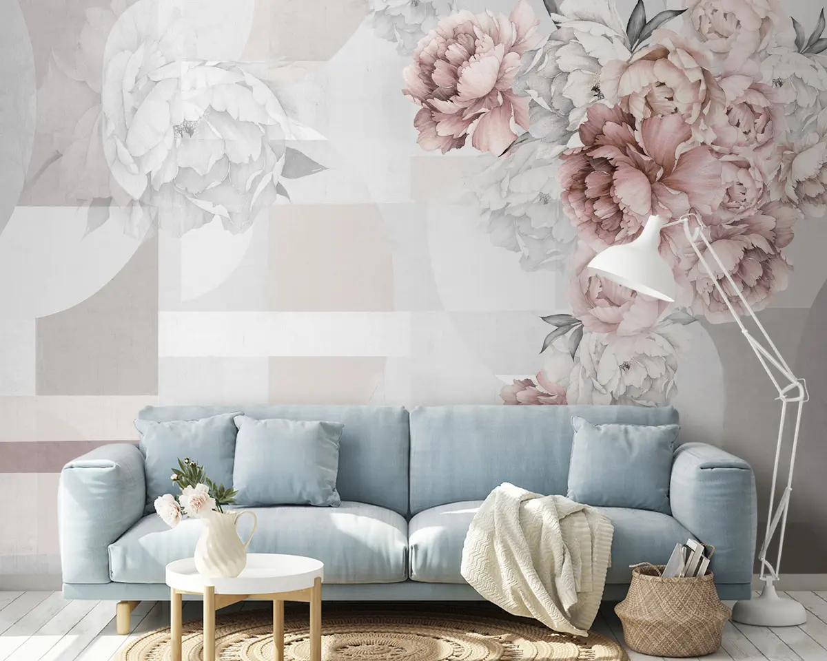 Wall Mural Photo Wallpaper Watercolor peonies in pink color with geometric background Nr. u95855
