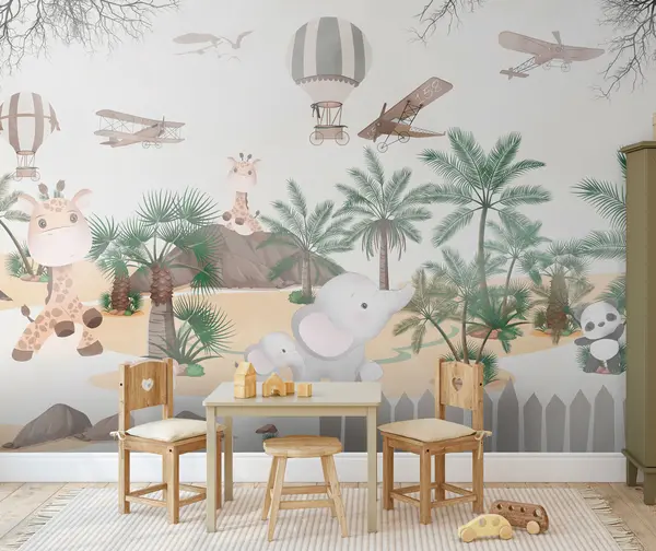 Wall Mural Photo Wallpaper Design with cute animals, tropical trees and balloons Nr. u95899