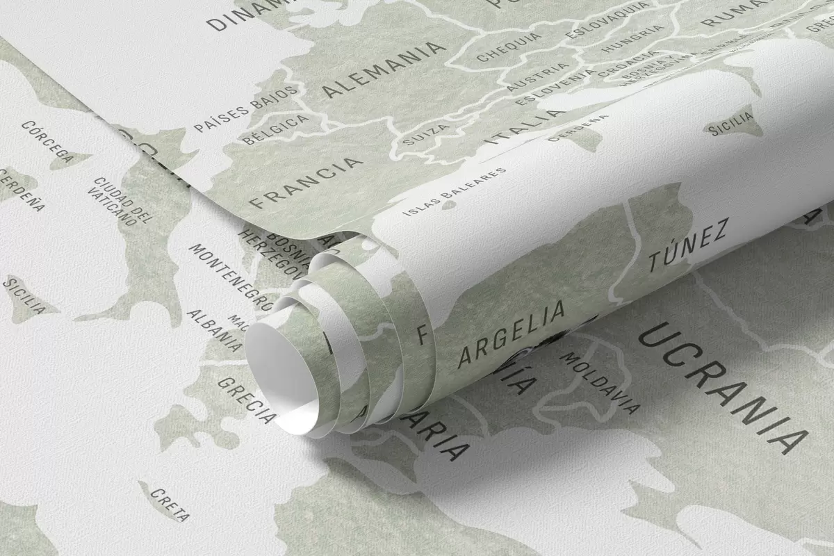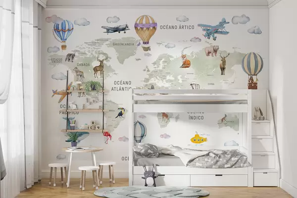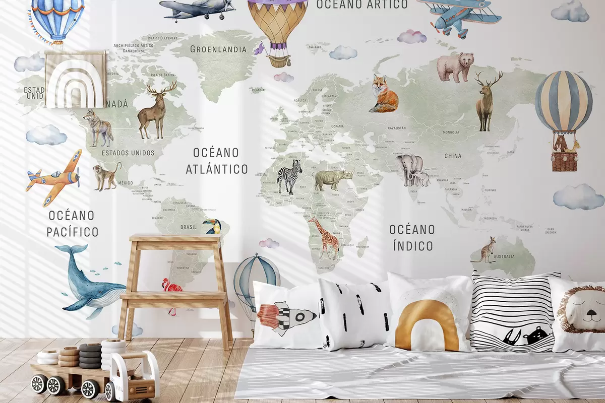 Wall Mural Photo Wallpaper Children's map in watercolour style with animals and hot air balloons. Spanish language. Green colour. Nr. c00001es