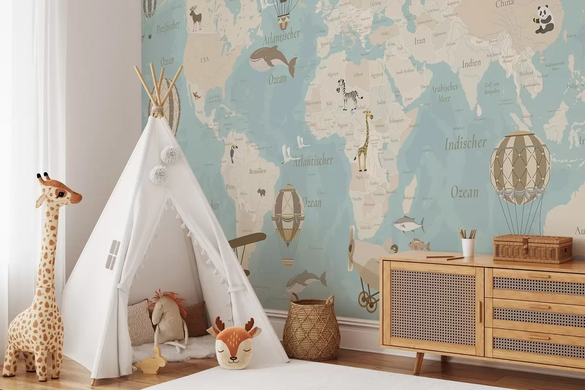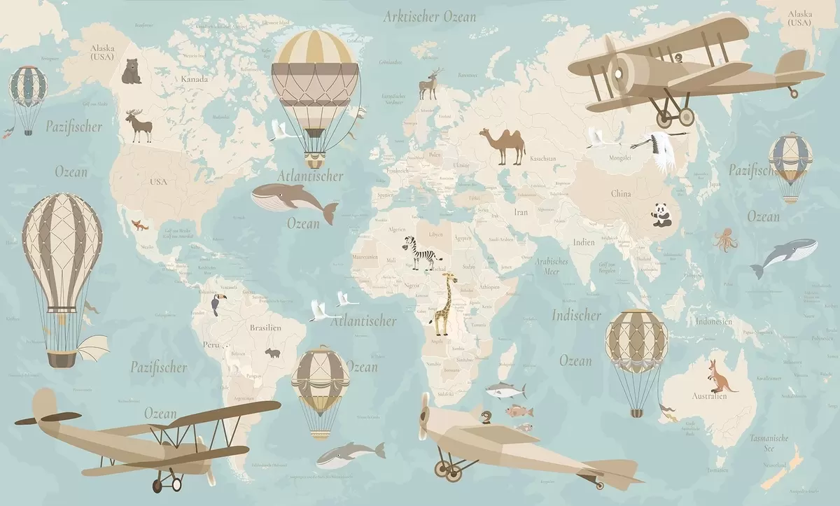 Wall Mural Photo Wallpaper Children's world map with animals, airplanes, and hot air balloons. German language. Blue color Nr. c00003dev1