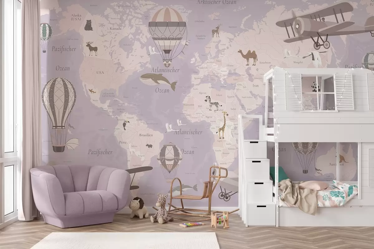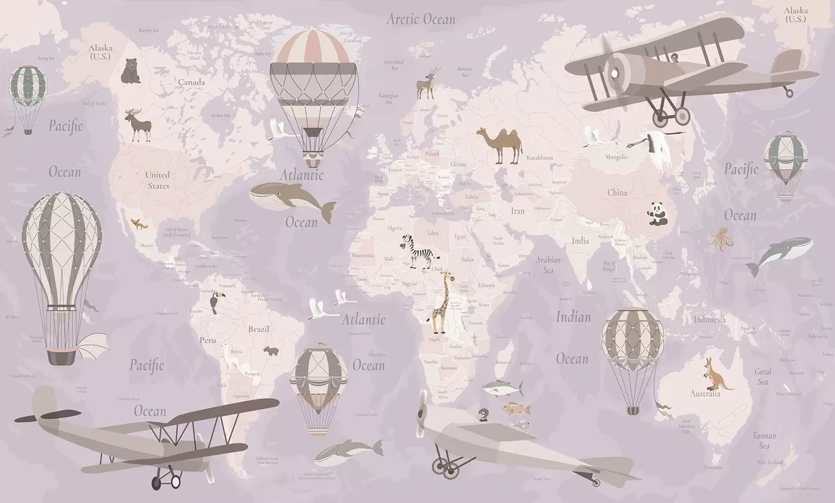 Wall Mural Photo Wallpaper Children's world map with animals, airplanes, and hot air balloons. English language. Purple color Nr. c00003env4