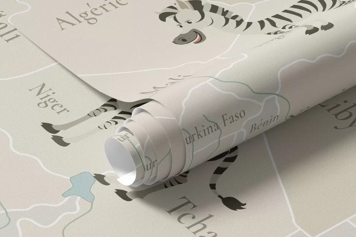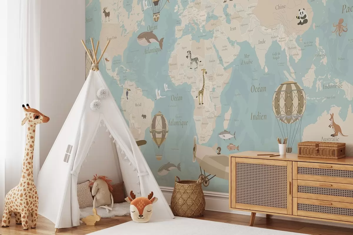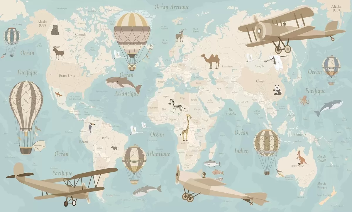 Wall Mural Photo Wallpaper Children's world map with animals, airplanes, and hot air balloons. French language. Blue color Nr. c00003frv1