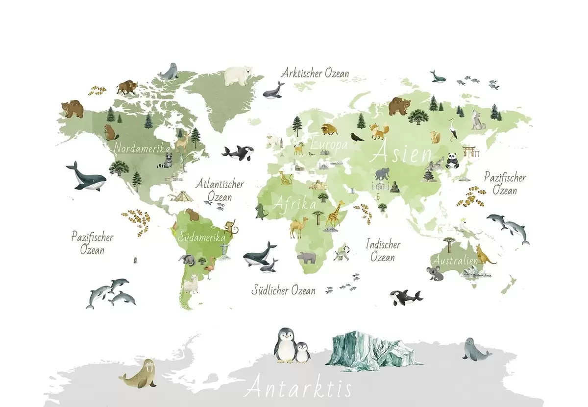 Wall Mural Photo Wallpaper A watercolor-style Green map featuring animals, plants, and architecture. Labels in German Nr. c00009dev2