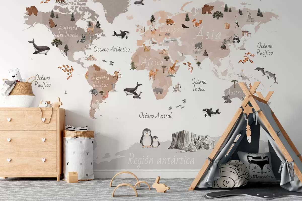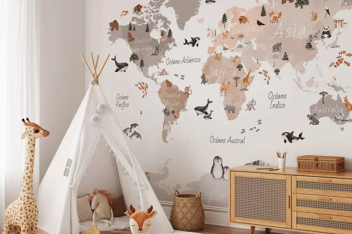 Wall Mural Photo Wallpaper A watercolor-style Beige map featuring animals, plants, and architecture. Labels in Spanish Nr. c00009esv3
