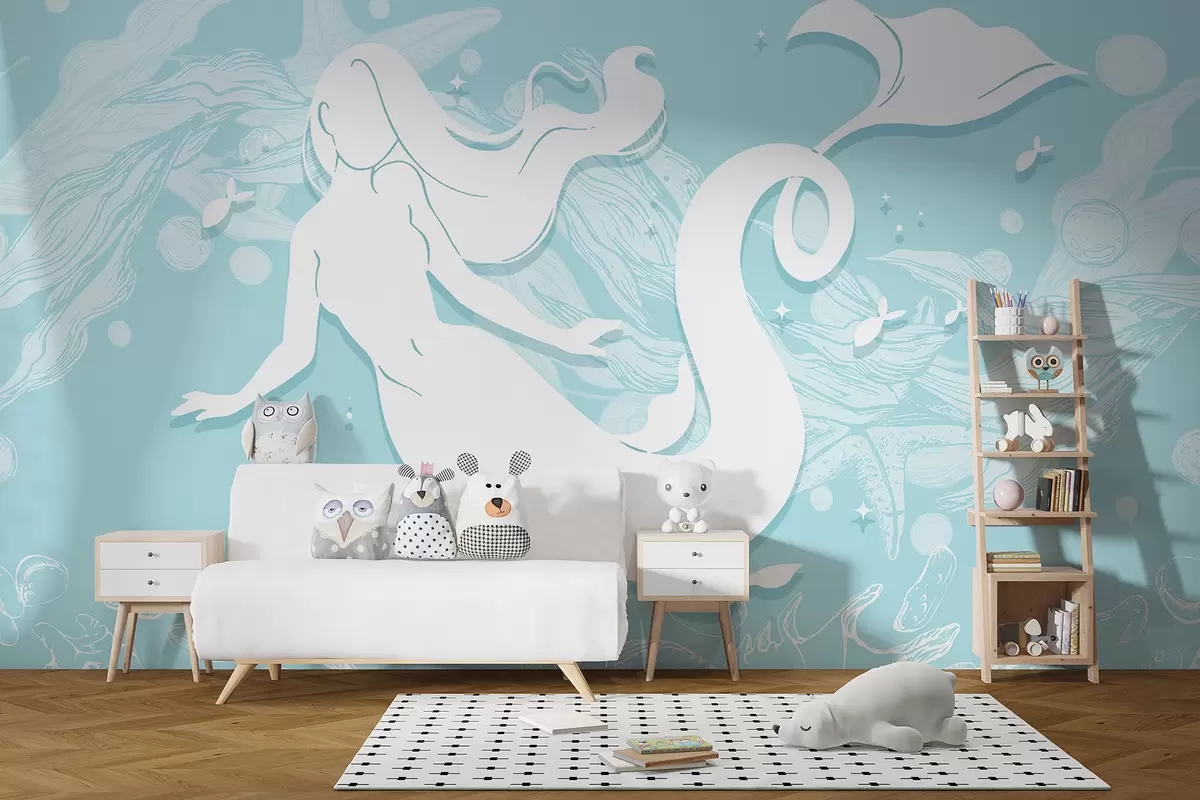Wall Mural Photo Wallpaper A white mermaid with long flowing hair swimming in a light blue ocean with white waves and bubbles Nr. w01316