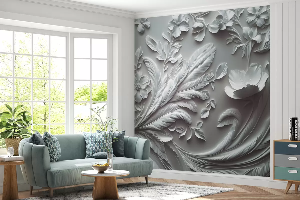 Wall Mural Photo Wallpaper Exquisite raised flowers and leaves in gray tones Nr. w01356v2