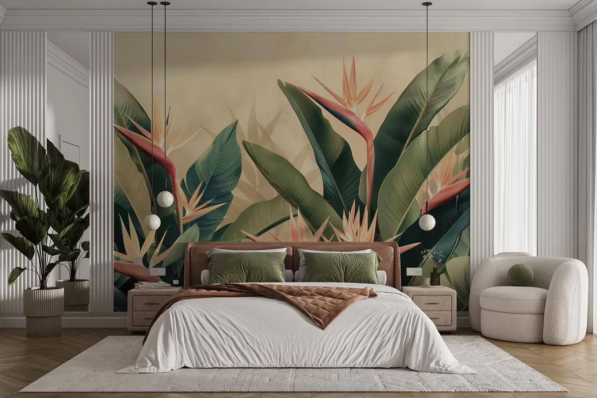 Wall Mural Photo Wallpaper Lush arrangement of tropical flowers surrounded by large dark green leaves Nr. w01484v1