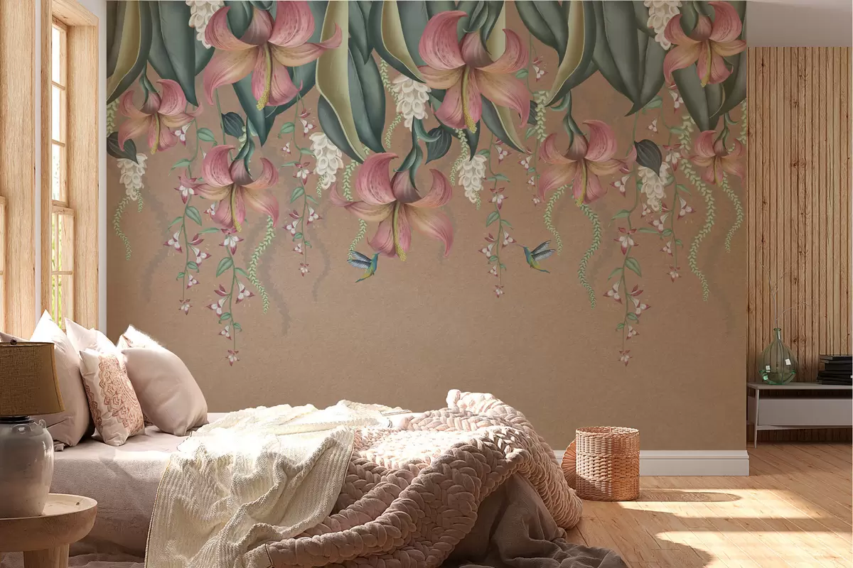 Wall Mural Photo Wallpaper Delicate botanical motif with hanging lilies, flowers and hummingbirds on a grunge wall Nr. w01523