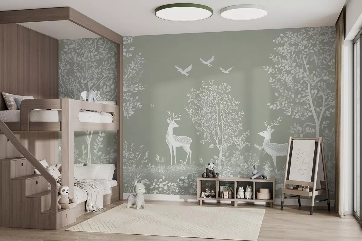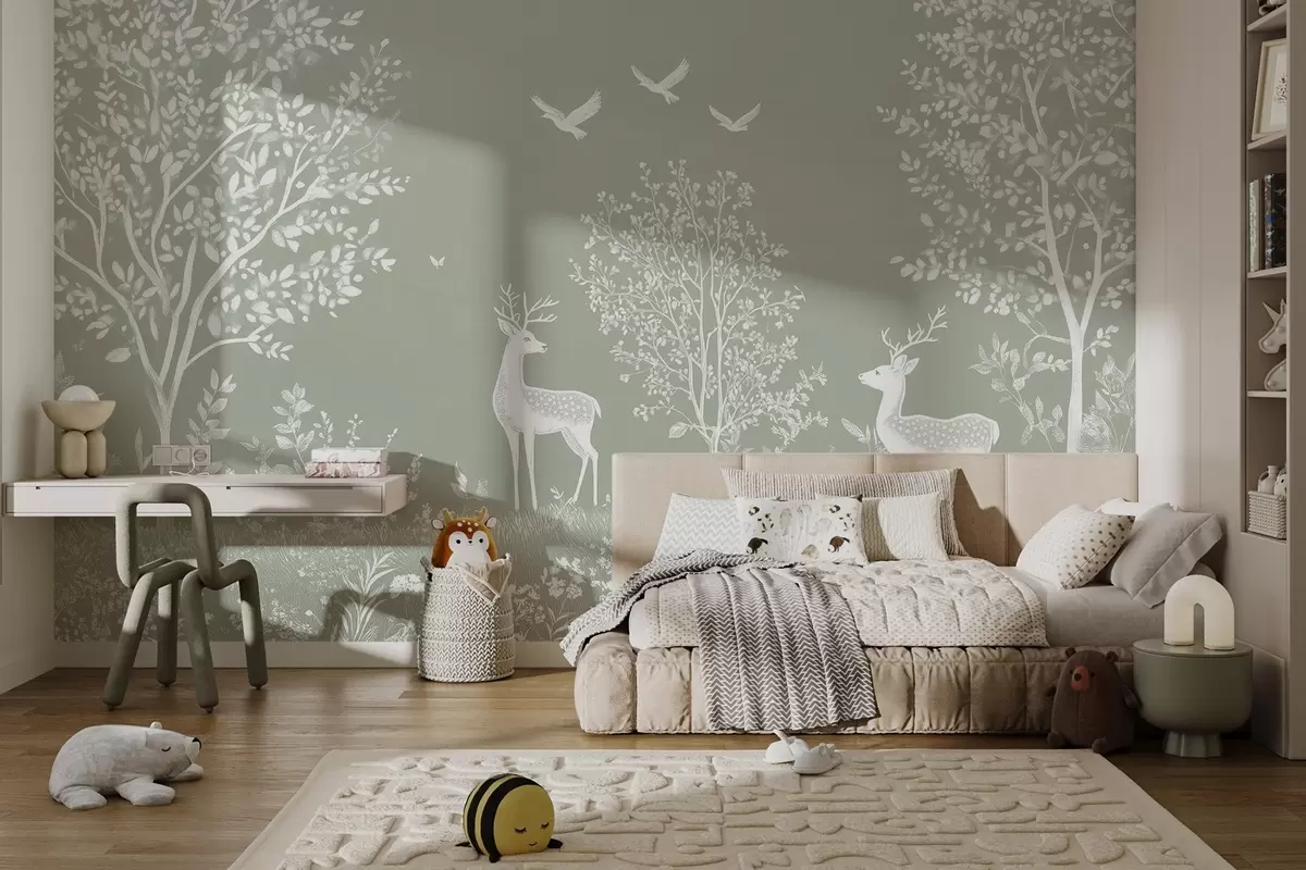 Wall Mural Photo Wallpaper forest with deer in the style of a chalk drawing on an olive background Nr. w02444v1