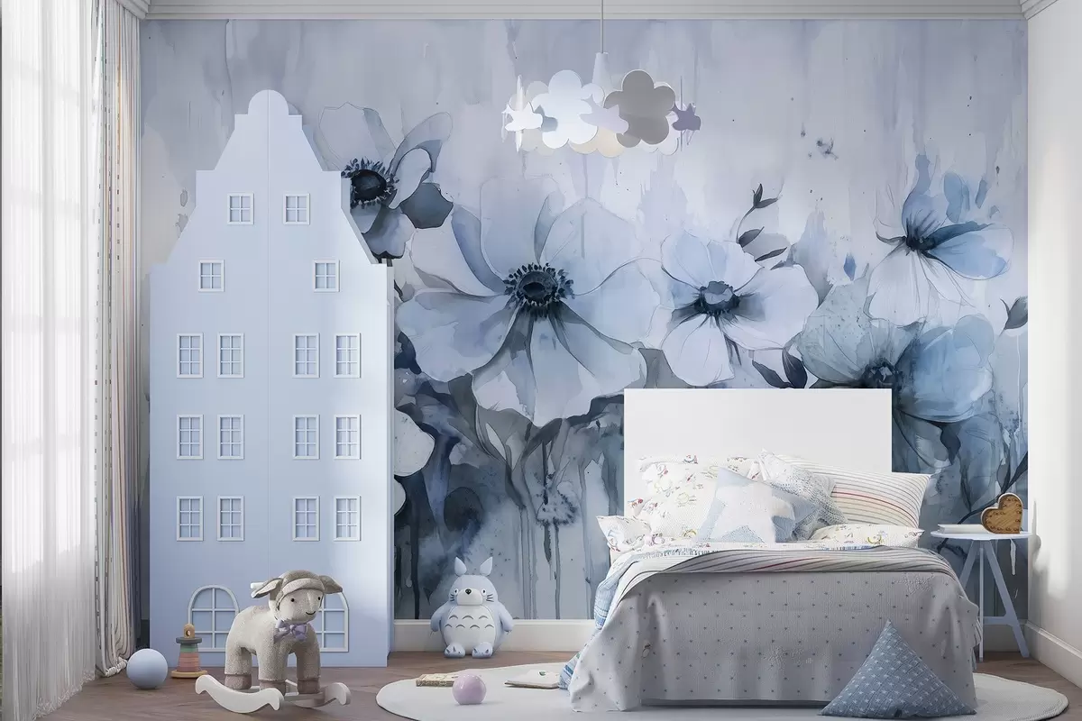 Wall Mural Photo Wallpaper Rustic flowers, watercolor style drawing, blue colors Nr. w02487v1