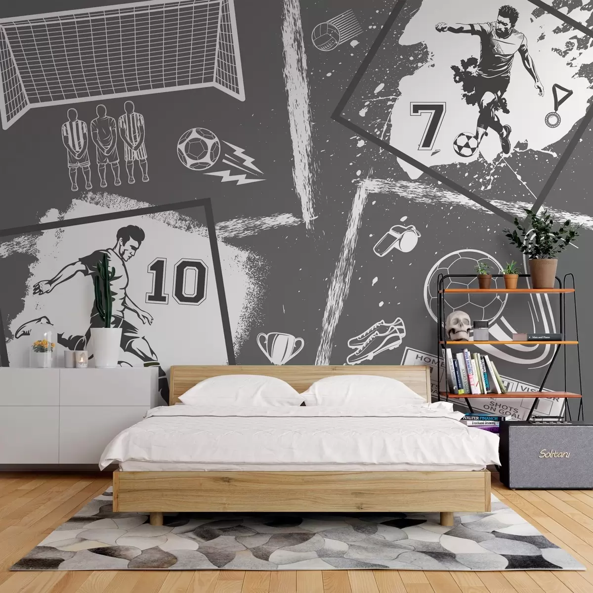 Wall Mural Photo Wallpaper Football players, ball and other soccer attributes in gray tones Nr. w03122v1