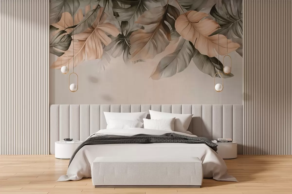 Wall Mural Photo Wallpaper Tropical leaves hanging from the top, on a textured background Nr. w03290