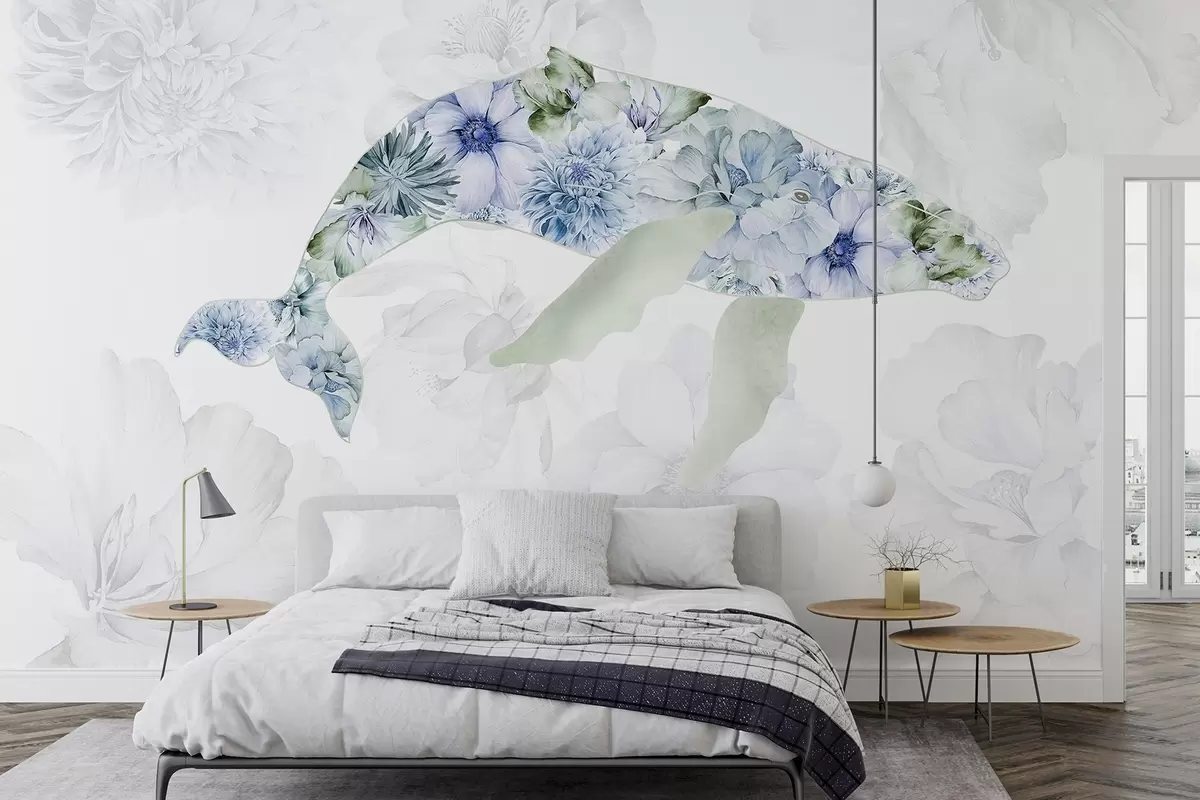 Wall Mural Photo Wallpaper Whale with watercolor flowers, ocean animals, minimalism, blue and green Nr. w03446v2