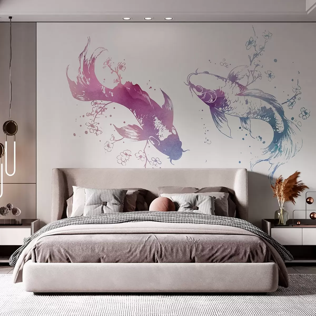 Wall Mural Photo Wallpaper Watercolor fish, oriental style, cherry tree, blue and purple Nr. w03447