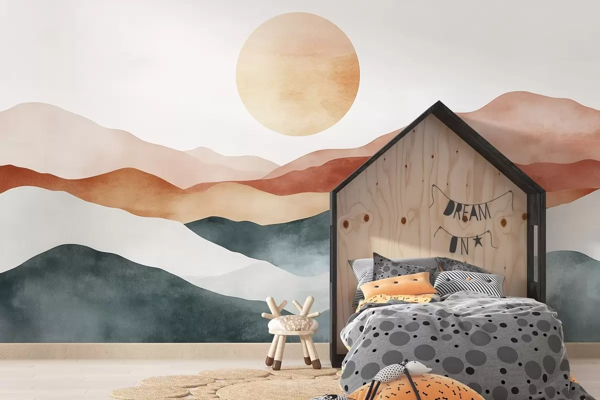 Wall Mural Photo Wallpaper Watercolor mountains with the Sun, boho style, red, orange, grey Nr. w03551