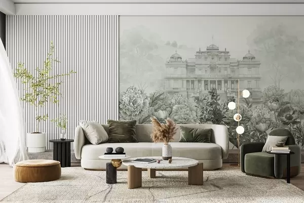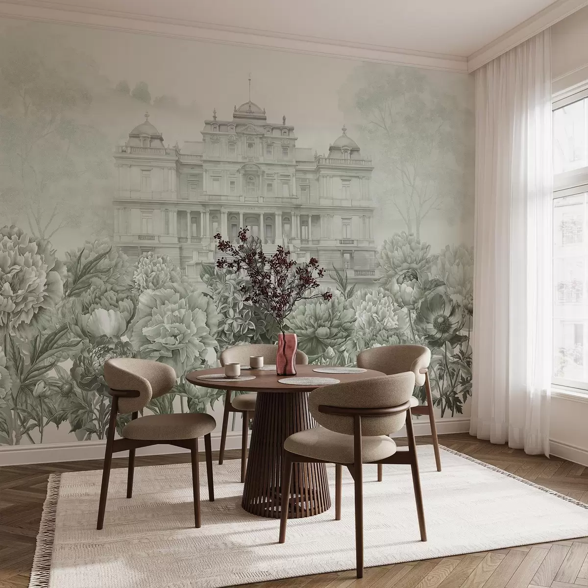 Wall Mural Photo Wallpaper Royal palace with peony garden, watercolor style, nature, green colors, boho Nr. w03552v2