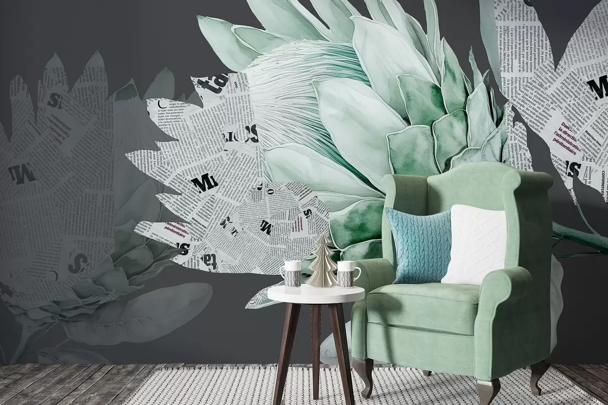 Wall Mural Photo Wallpaper Protea flowers, newspaper art, floral, tropical, dark background, green colors Nr. w03667v3
