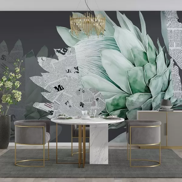 Wall Mural Photo Wallpaper Protea flowers, newspaper art, floral, tropical, dark background, green colors Nr. w03667v3