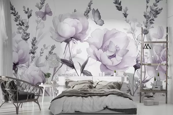 Wall Mural Photo Wallpaper Flower meadow, peonies, lavender, butterflies, watercolor style, puple colors w03668v3