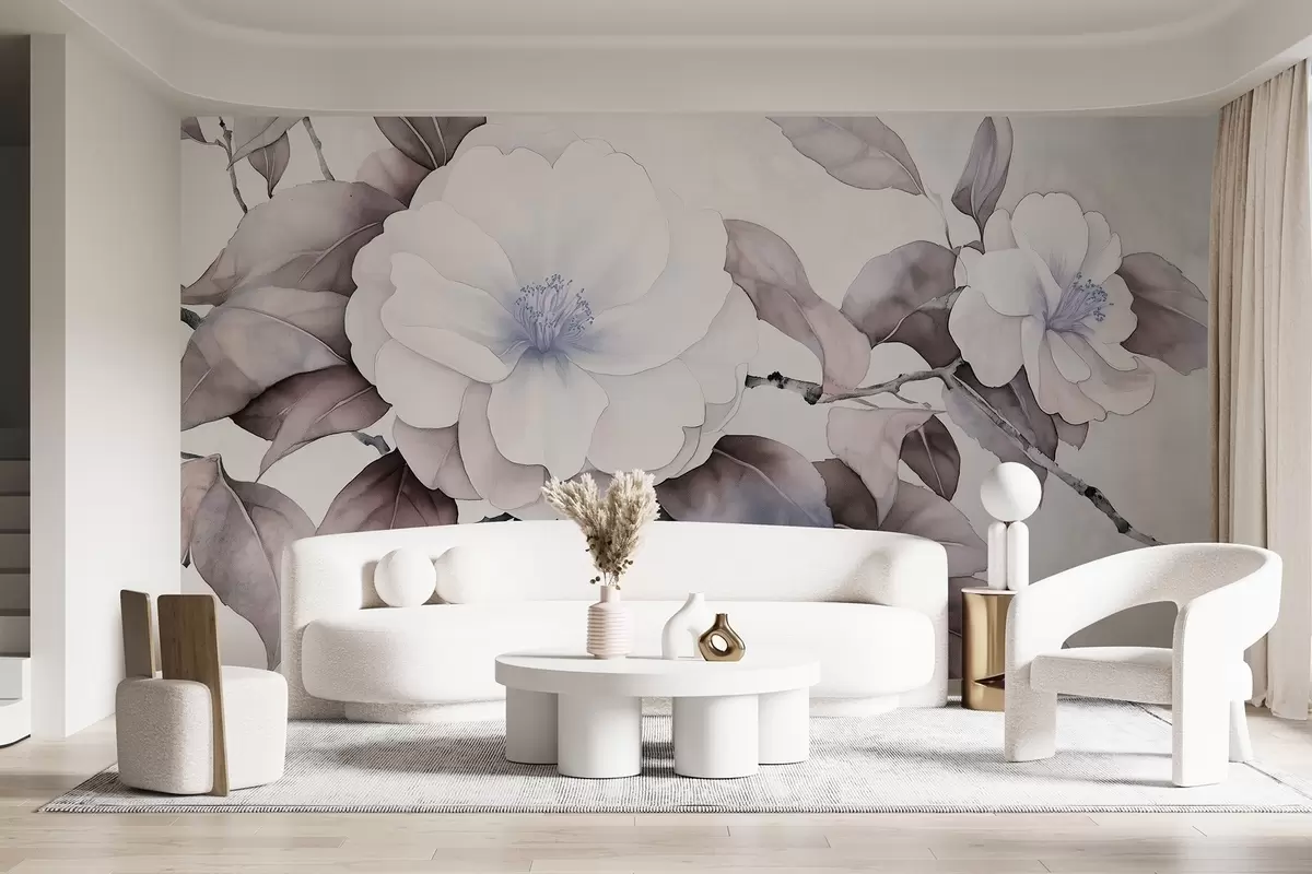 Wall Mural Photo Wallpaper Watercolor style camellia flowers on the branch, purple colors Nr. w03761v1