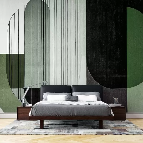 Wall Mural Photo Wallpaper modern abstract geometric composition with overlapping shapes and vertical line patterns, thin lines filling trapezoids and ovals, soft textile texture overlay, warm muted tones like olive green, taupe, beige and charcoal, subtle transparency effects between shapes Nr. w03937v3