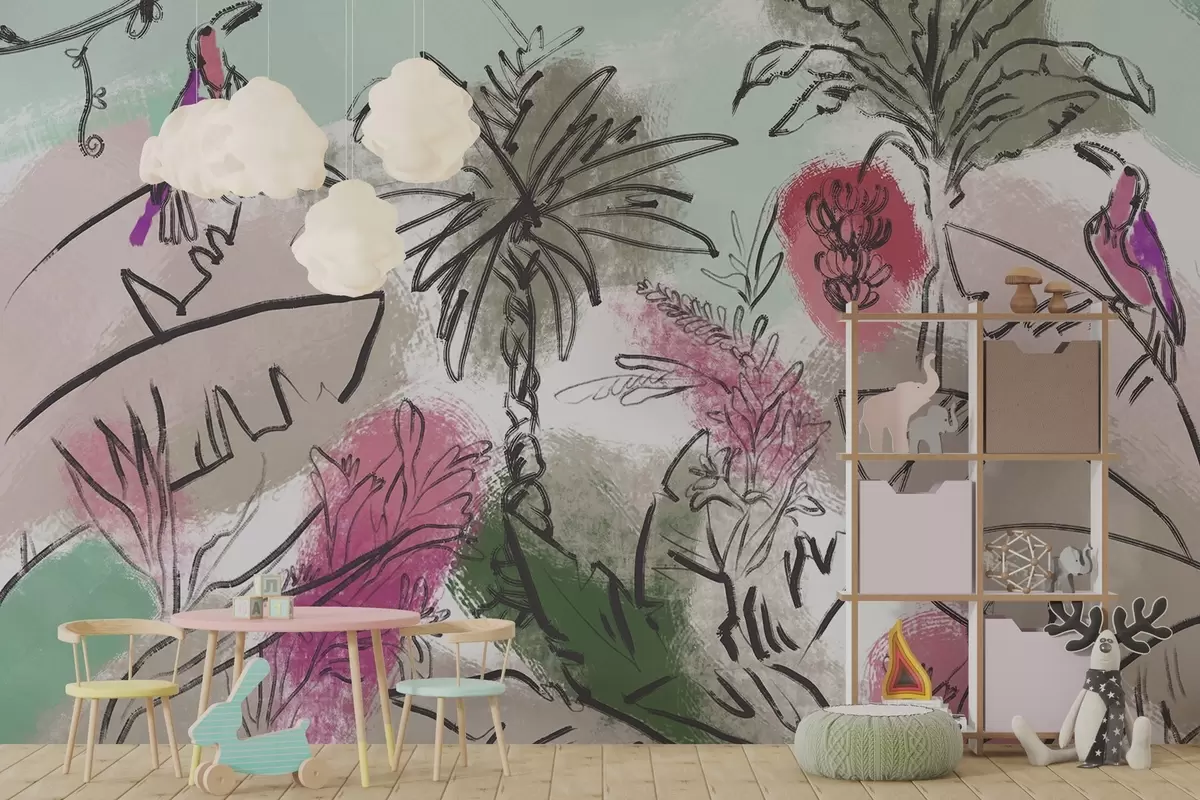 Wall Mural Photo Wallpaper Tropical print with pink flowers, exotic parrots Nr. w04019v1