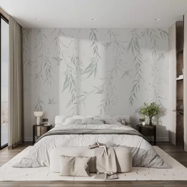 Wall Mural Photo Wallpaper Twigs with green leaves hanging and birds Nr. w04052