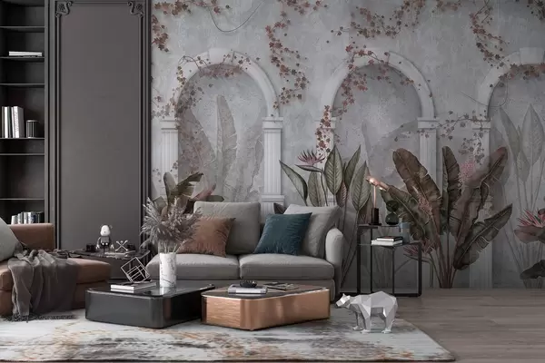 Wall Mural Photo Wallpaper Concrete wall with arches and tropical plants, floral, burgundy colors Nr. w04065v1