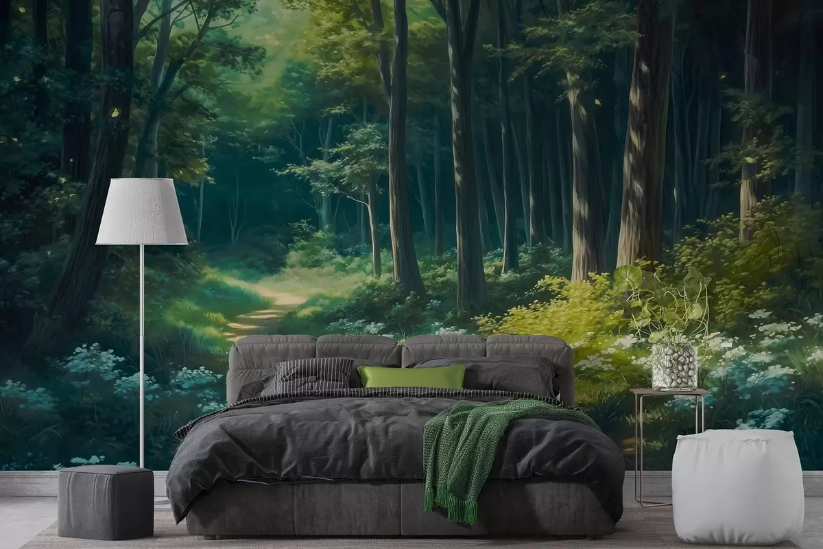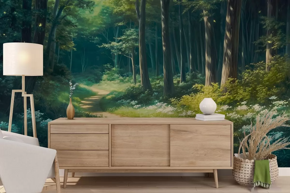 Wall Mural Photo Wallpaper Green forest with gentle sunlight, trees and white flowers, oil style drawing Nr. w04118