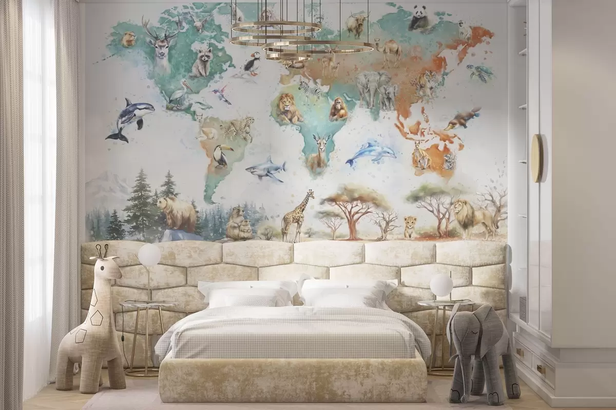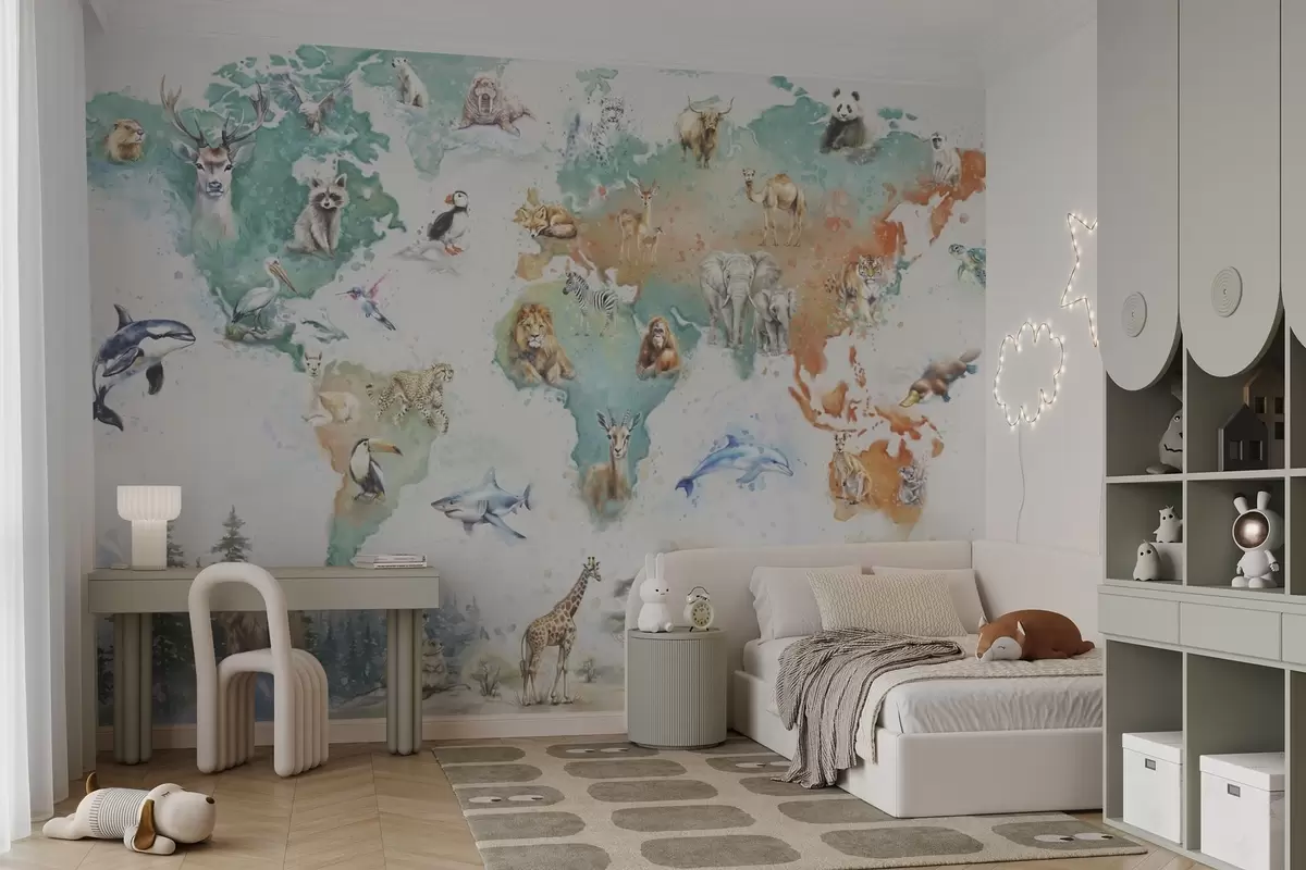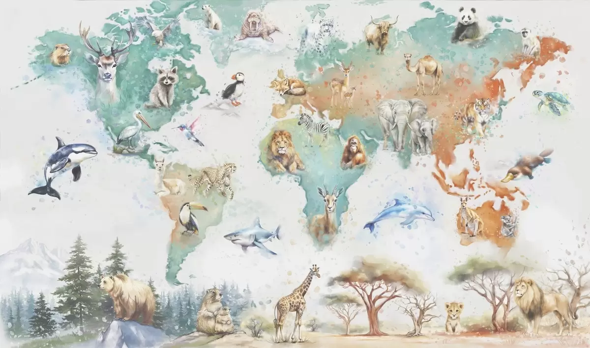 Wall Mural Photo Wallpaper World map with animals, children's educational illustration style Nr. w04148