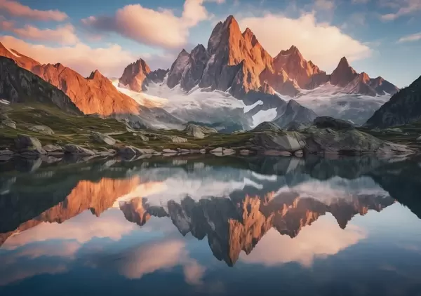 Wall Mural Photo Wallpaper Mountains at dawn, reflection in water, realistic landscape Nr. w04150