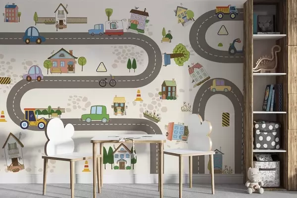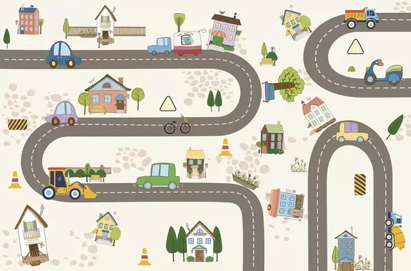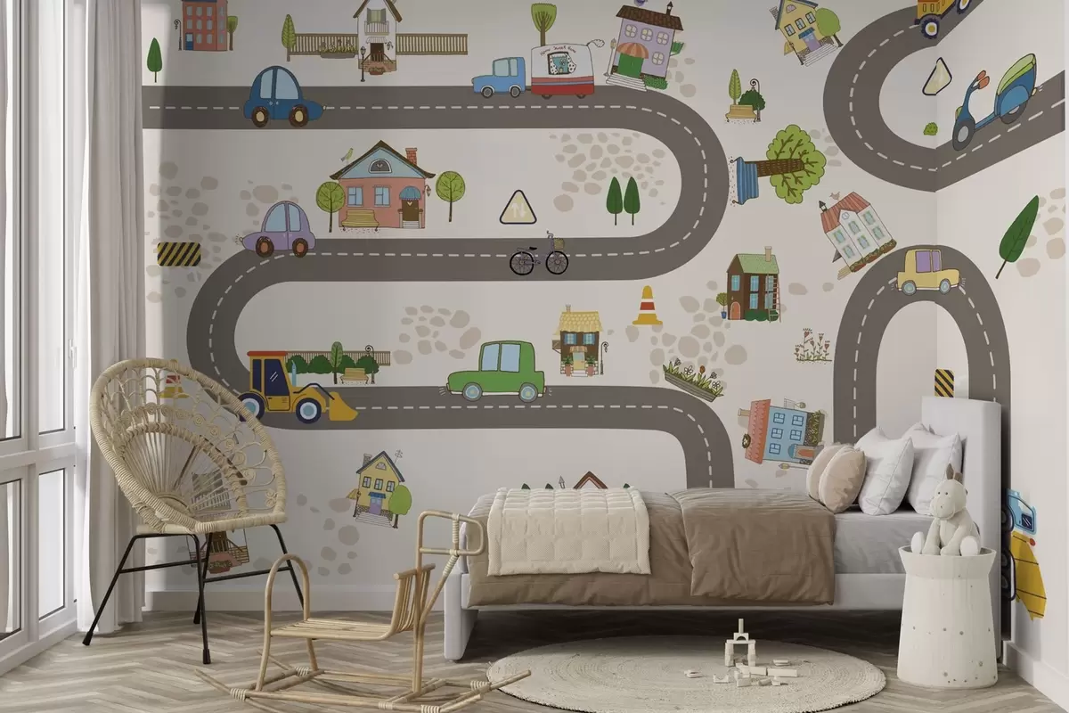 Wall Mural Photo Wallpaper Children’s road with cars and colorful houses Nr. w04404