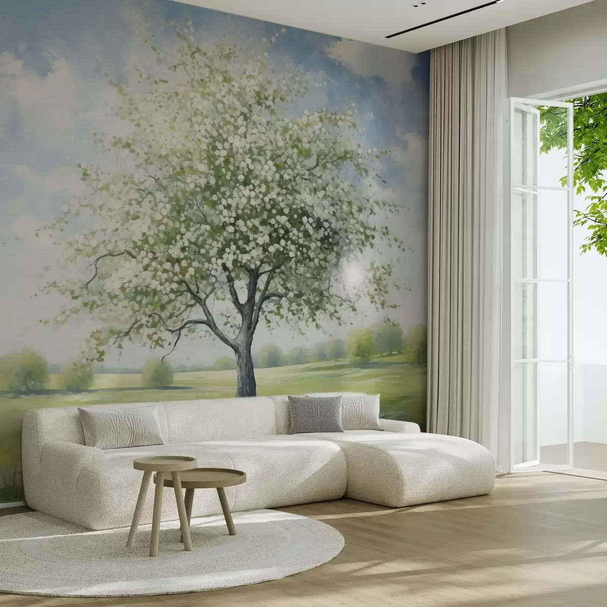 Wall Mural Photo Wallpaper A lone tree in a field with white flowers Nr. w04445