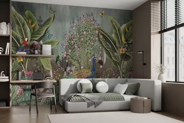 Wall Mural Photo Wallpaper Bright tropical birds and peacock among exotic plants Nr. w04457