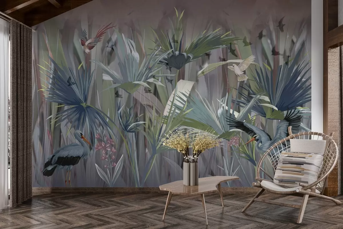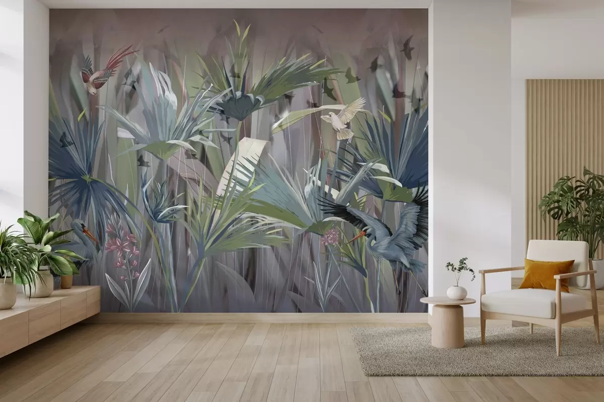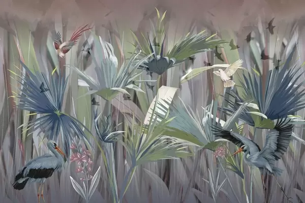 Wall Mural Photo Wallpaper Exotic birds among palm leaves and flowers Nr. w04458