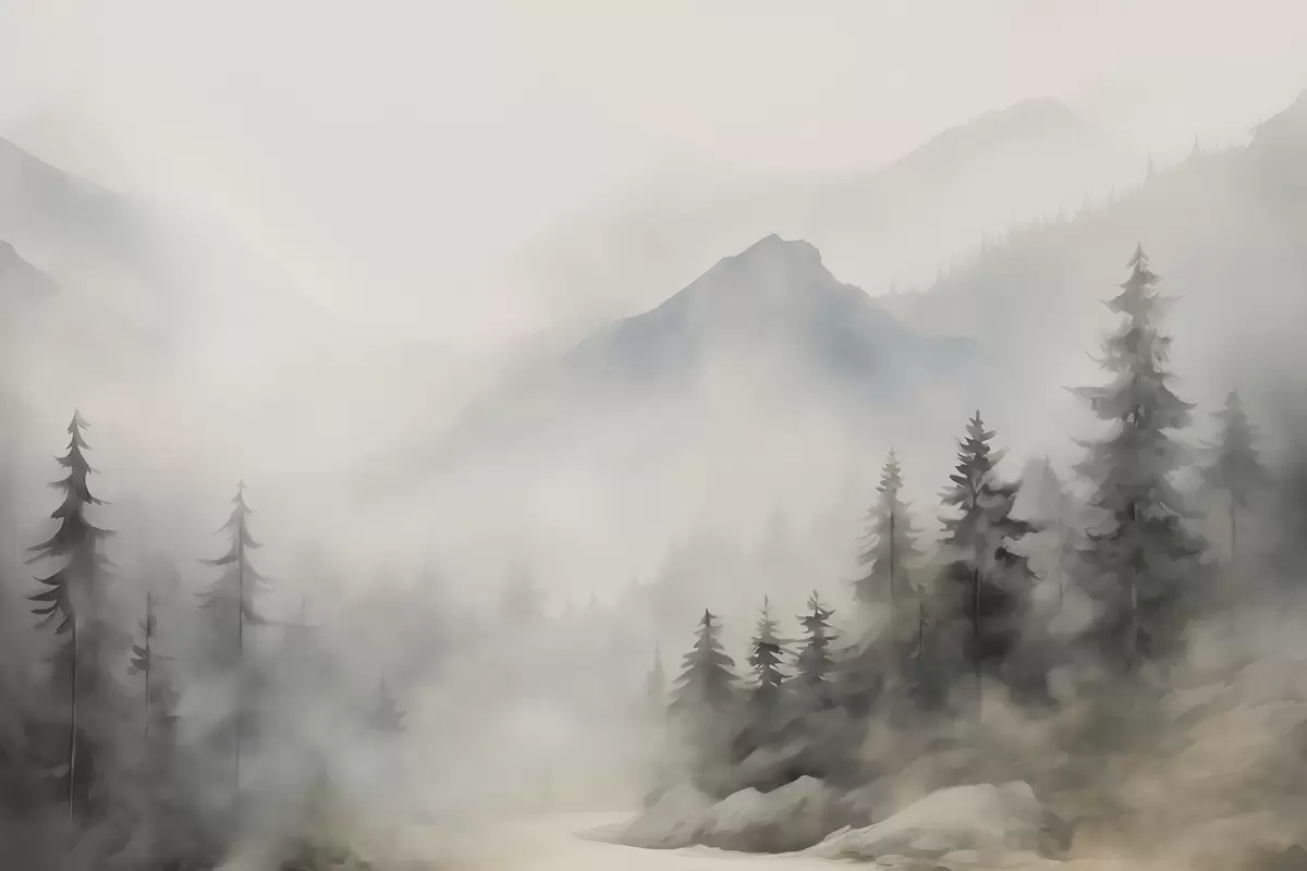 Wall Mural Photo Wallpaper Forest in the fog against the backdrop of mountains Nr. w04493