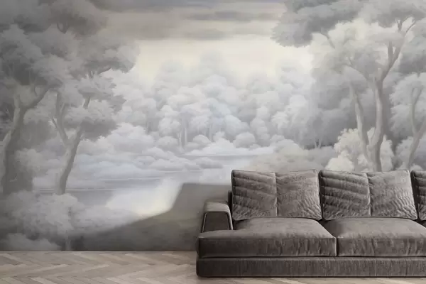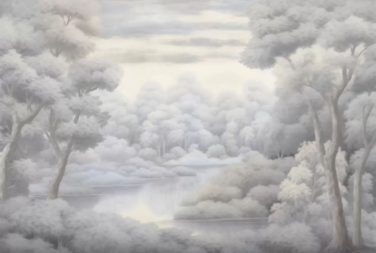 Wall Mural Photo Wallpaper Misty forest and lake in soft gray tones w04617