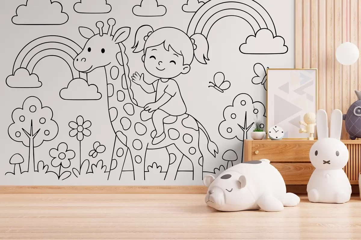 Wall Mural Photo Wallpaper black and white drawing of a girl on a giraffe in the style of a children's colouring book Nr. w04753