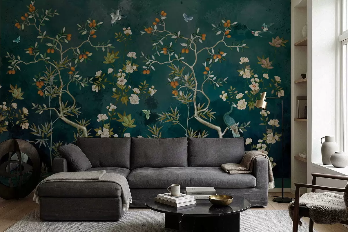 Wall Mural Photo Wallpaper Decorative scene with trees, flowers and birds on dark background Nr. w05004