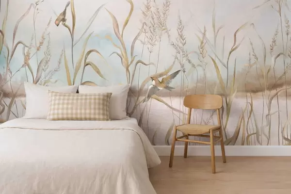 Wall Mural Photo Wallpaper Illustration of reeds and birds by water in soft tones Nr. w05125