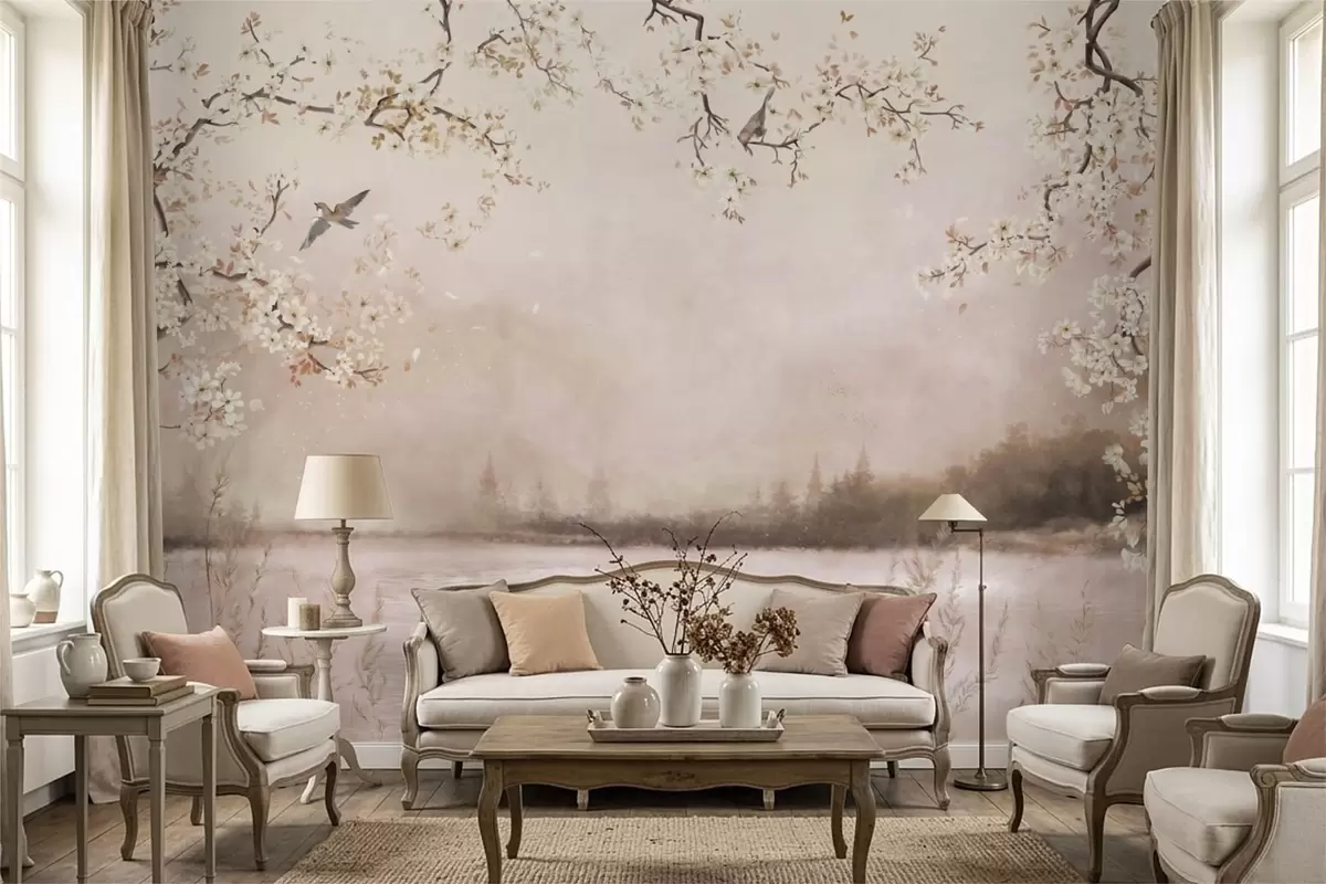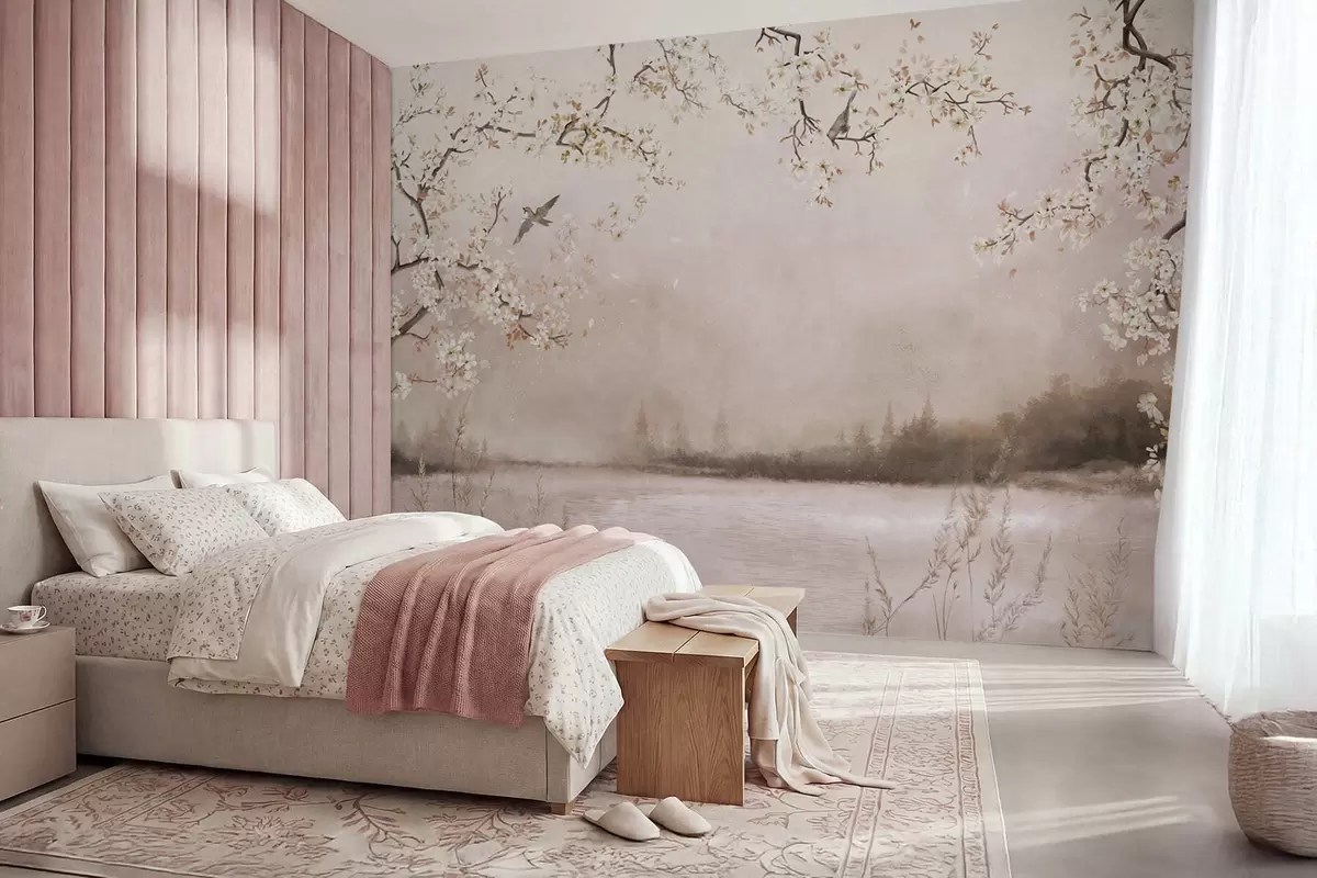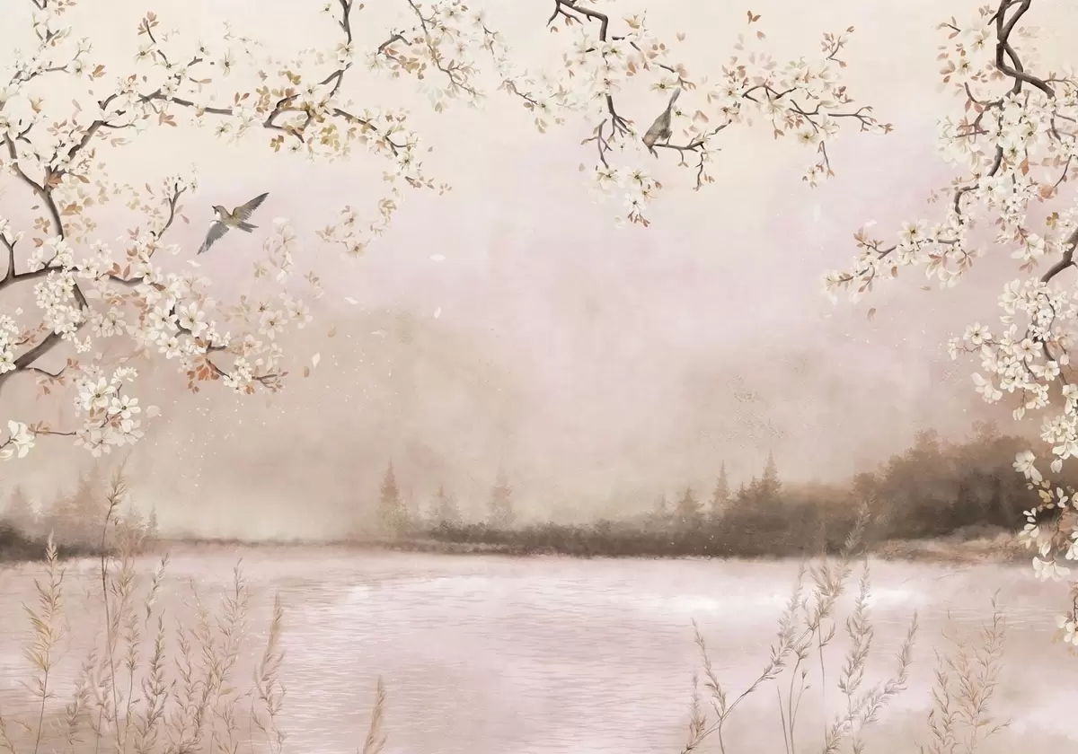 Wall Mural Photo Wallpaper Blooming branches above calm lake with birds in mist Nr. w05155v1
