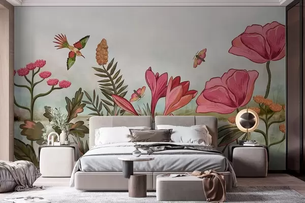 Wall Mural Photo Wallpaper Bright flowers with bird and butterflies Nr. w05321