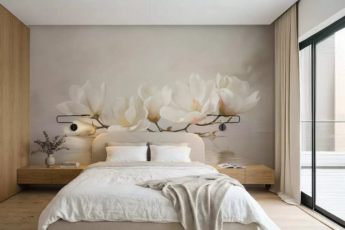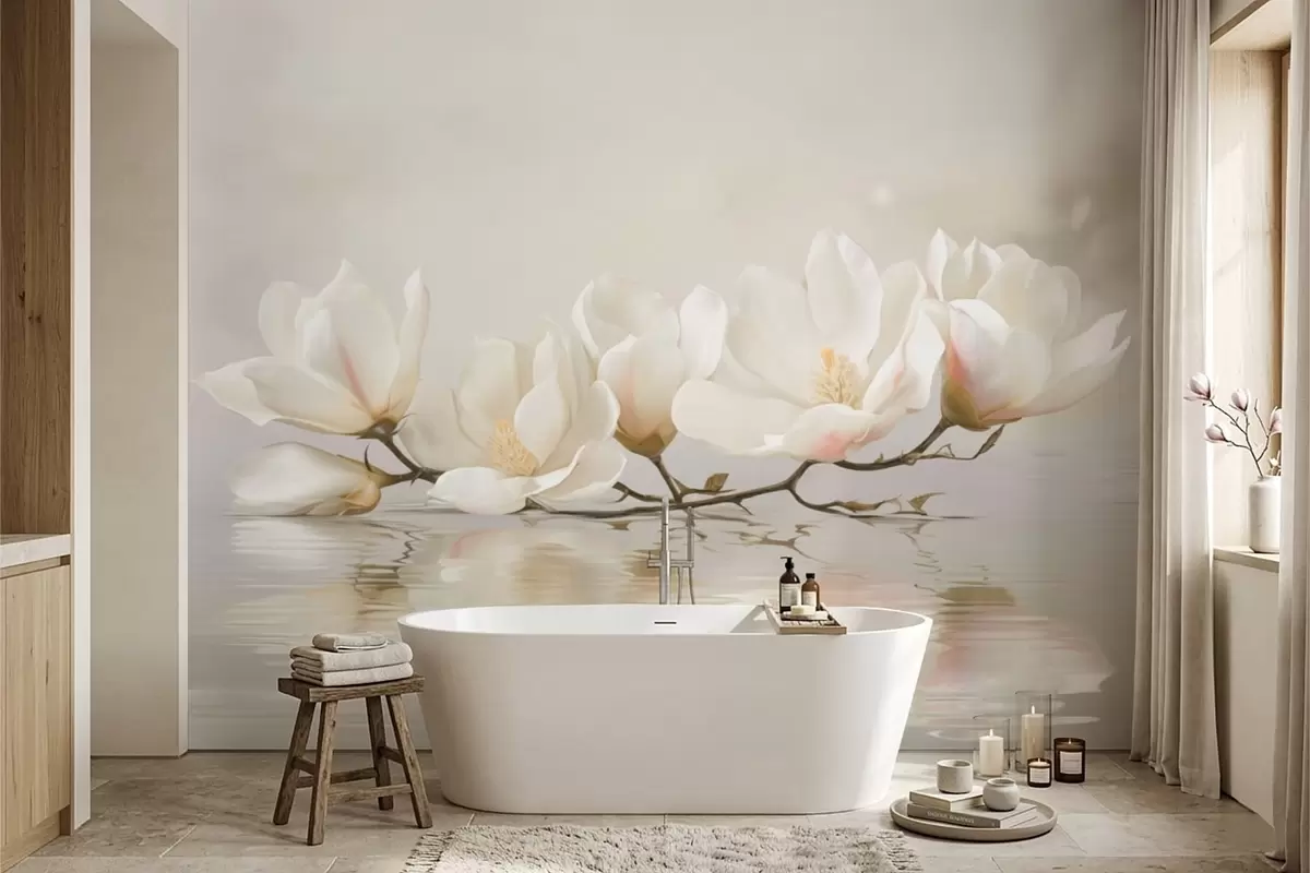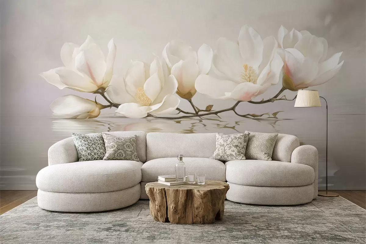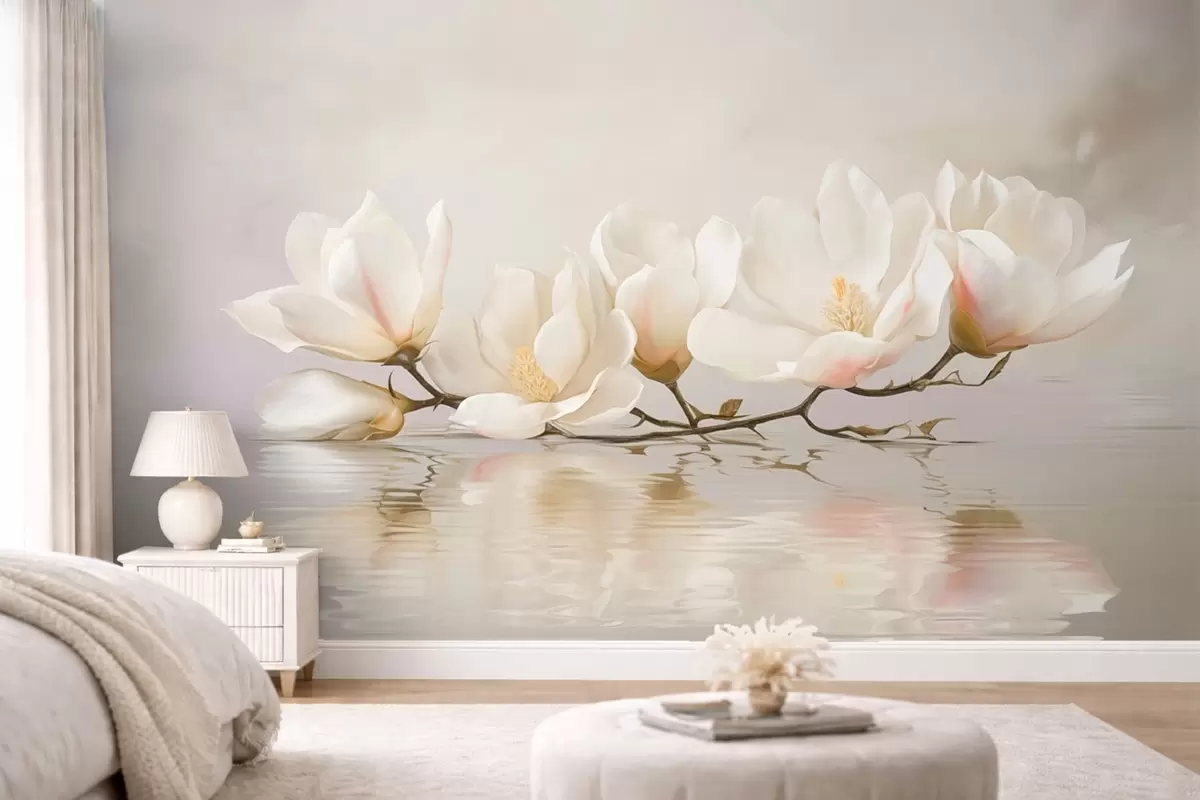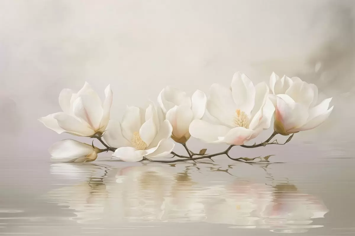 Wall Mural Photo Wallpaper Light magnolia blossoms on branch above water reflection Nr. w05353