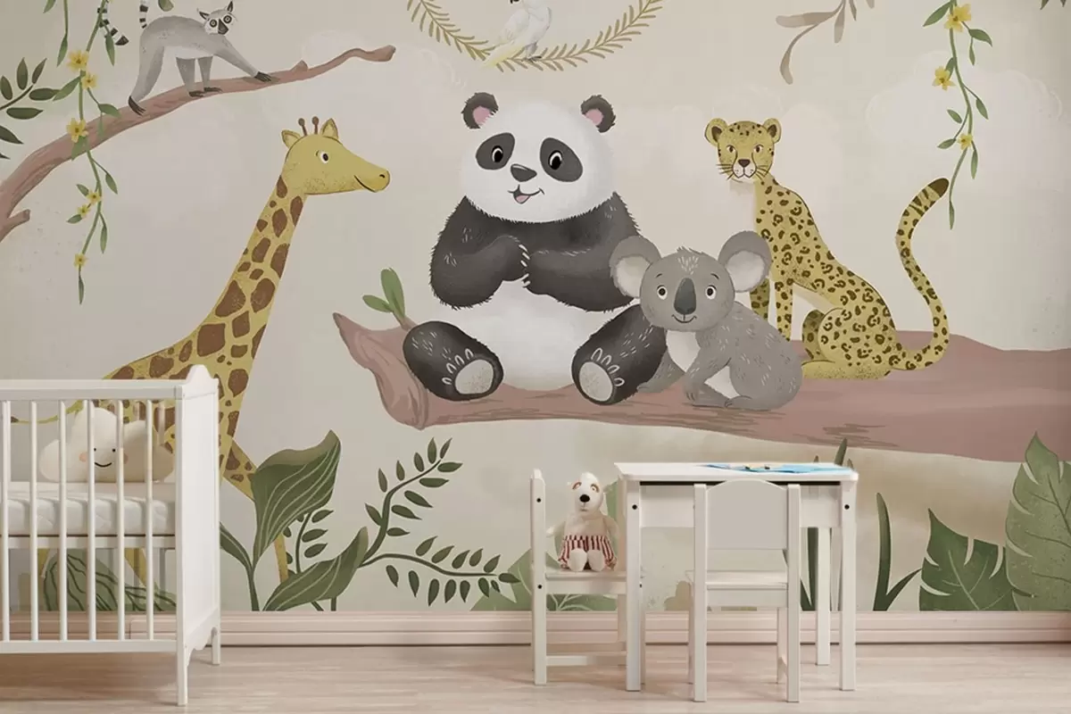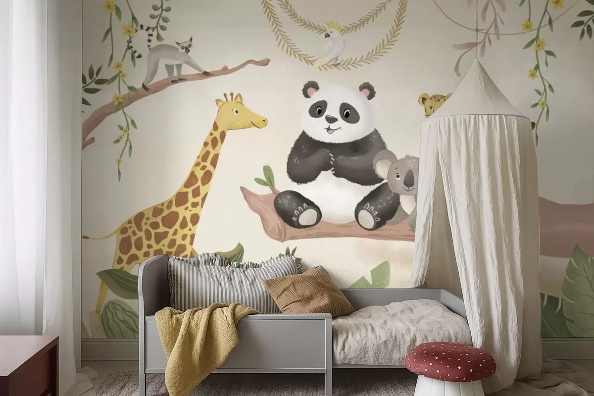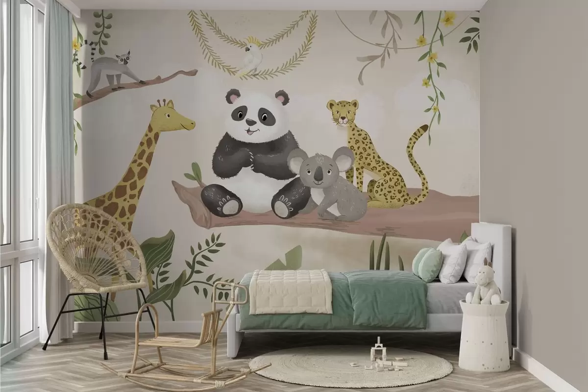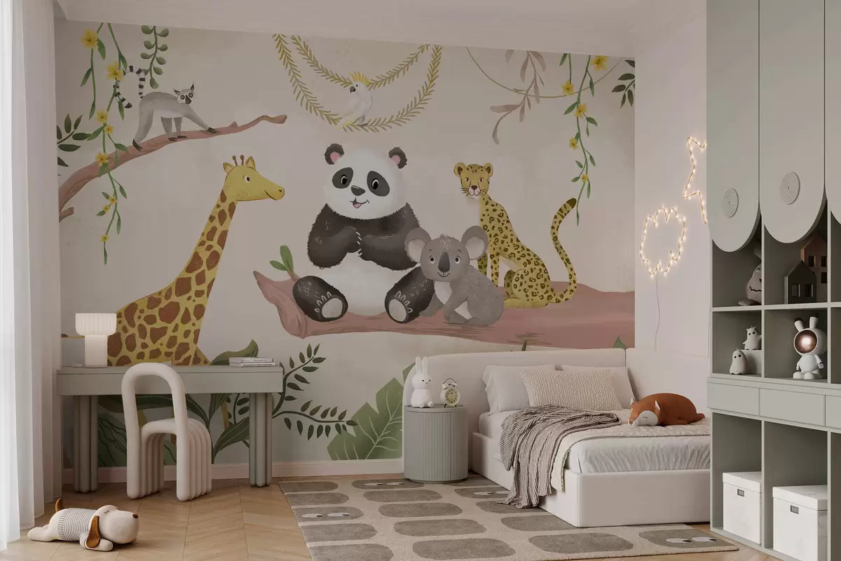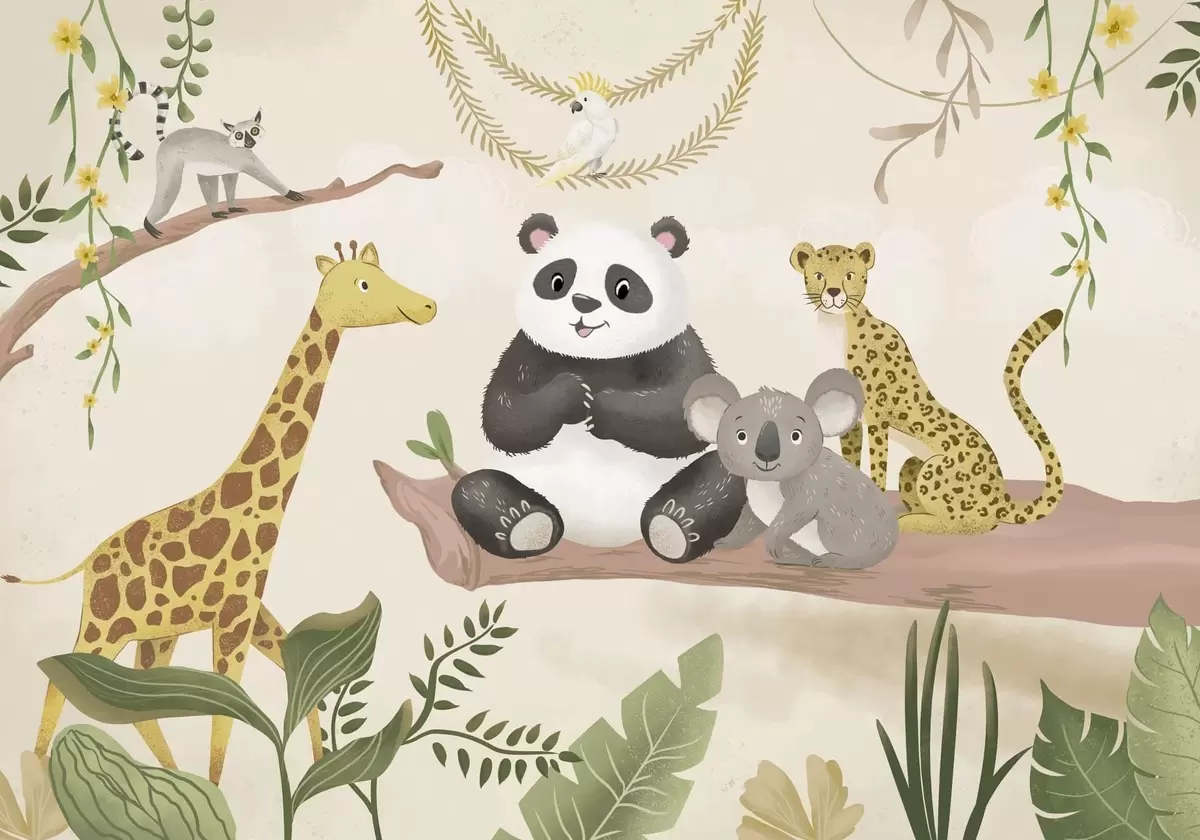 Wall Mural Photo Wallpaper Cute jungle animals on a branch among plants Nr. w05393