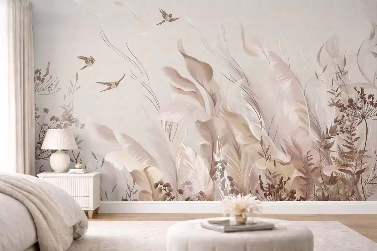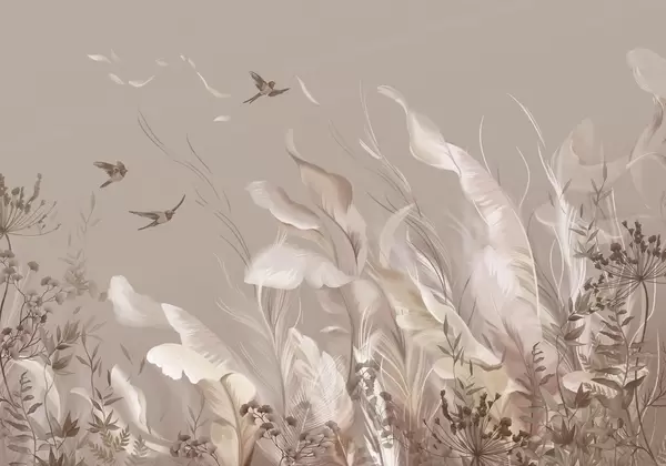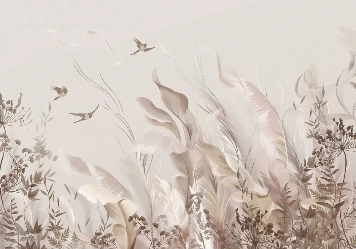 Wall Mural Photo Wallpaper Soft feathers, grasses and birds in light tones Nr. w05395